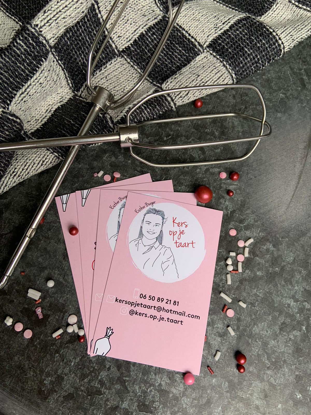 Gerda ontwierp ook offline uitingen, zoals stickers en visitekaartjes voor op én in de gebaksdozen.